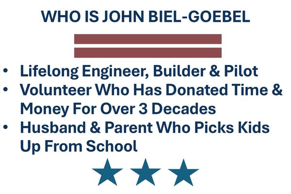 John Biel-Goebel is running for the U.S. Senate because he believes the nation has reached an inflection point, one where trust, integrity, and pragmatic problem-solving must return to government. For more than two decades, John has led complex aerospace programs where failure meant lives and safety were on the line. In that world, accountability, precision, and teamwork are non-negotiable, and he wants Washington to operate the same way.